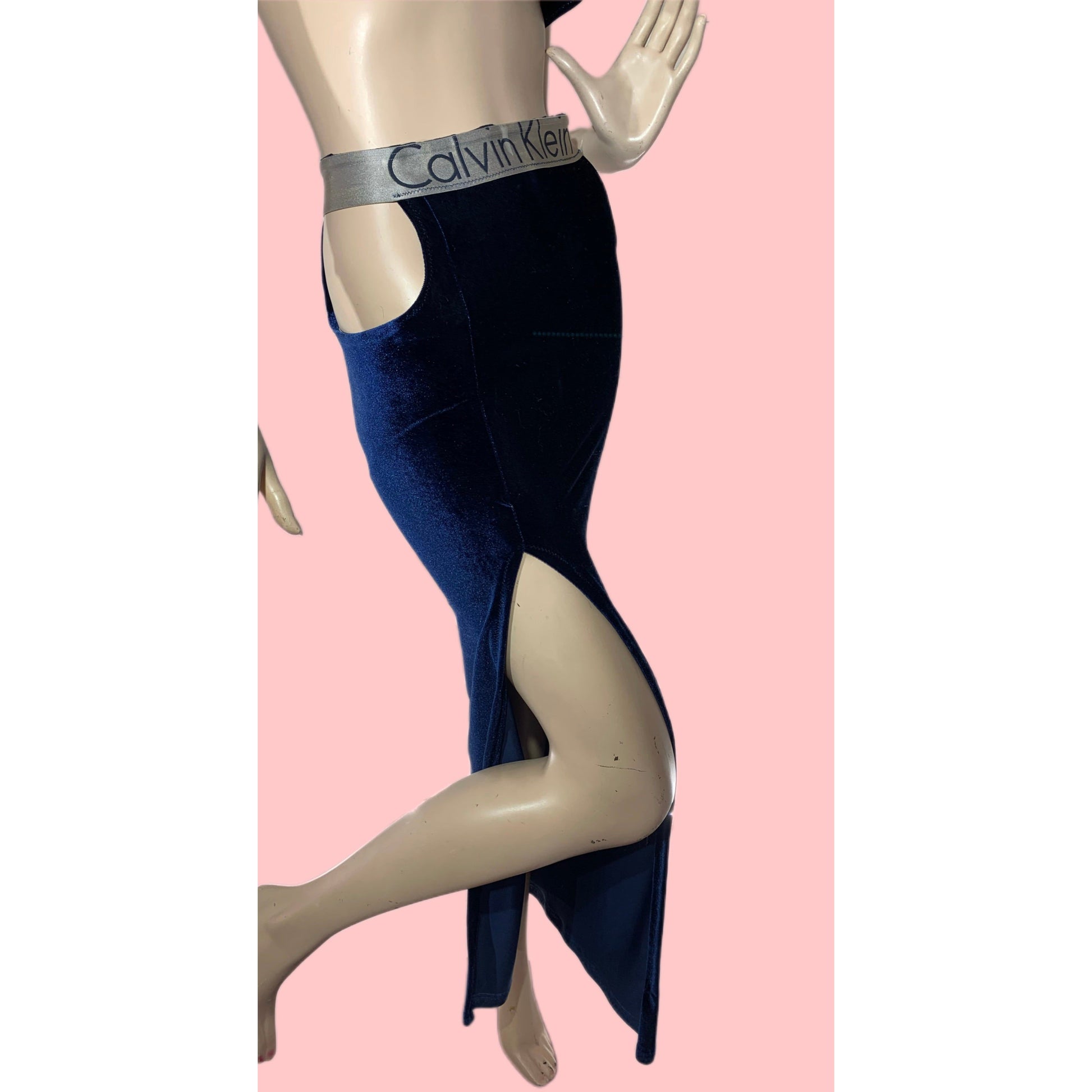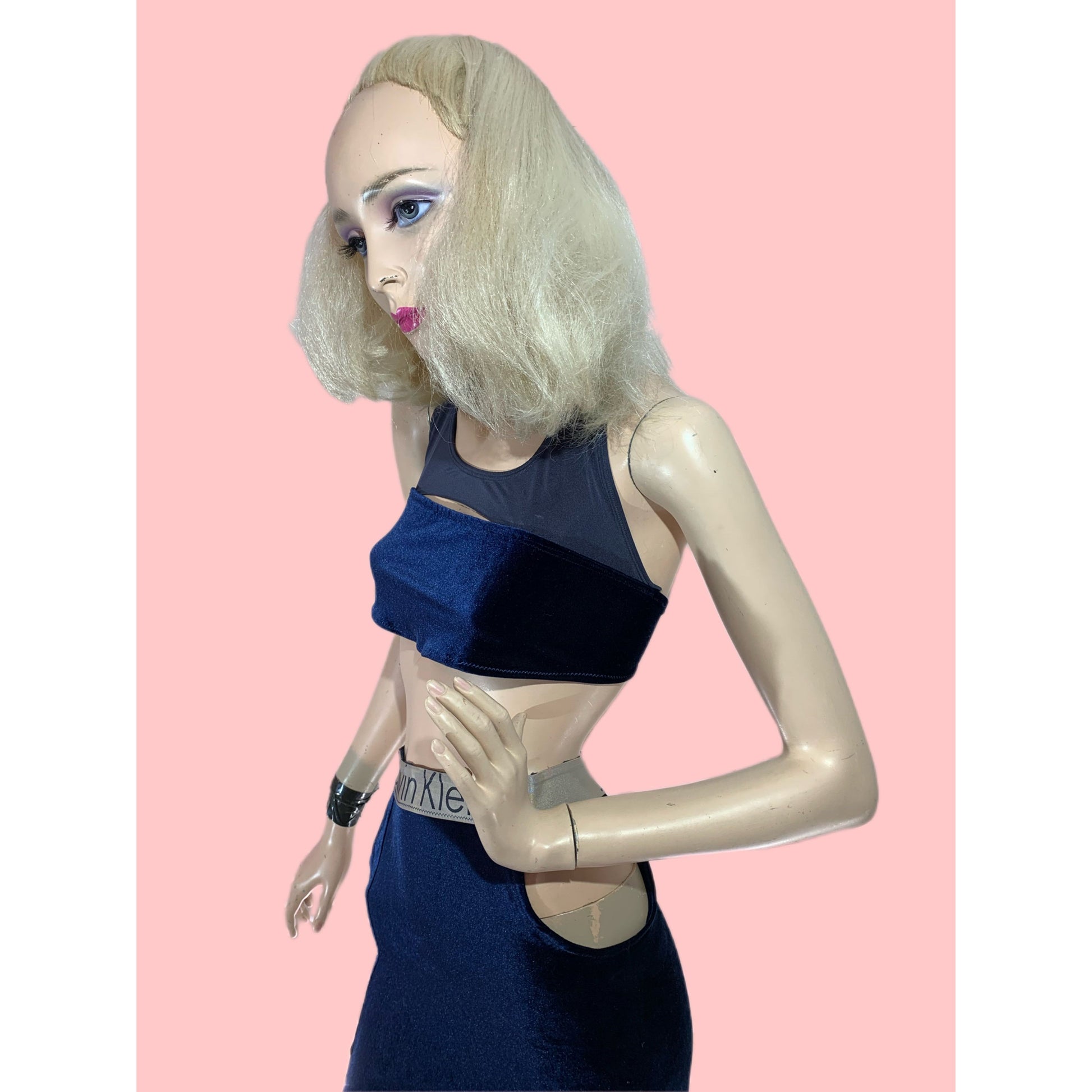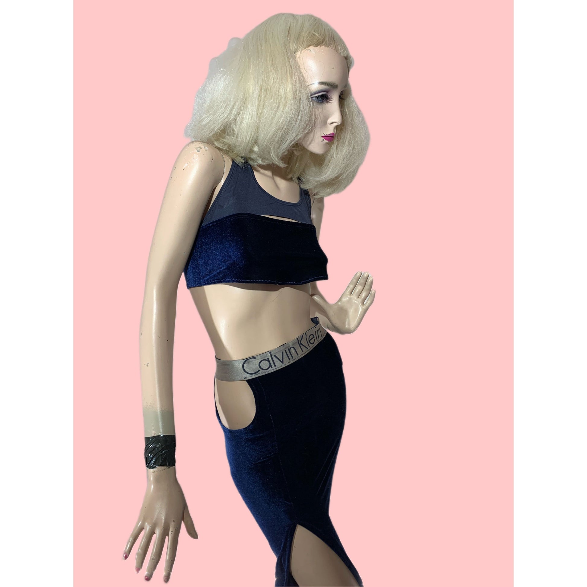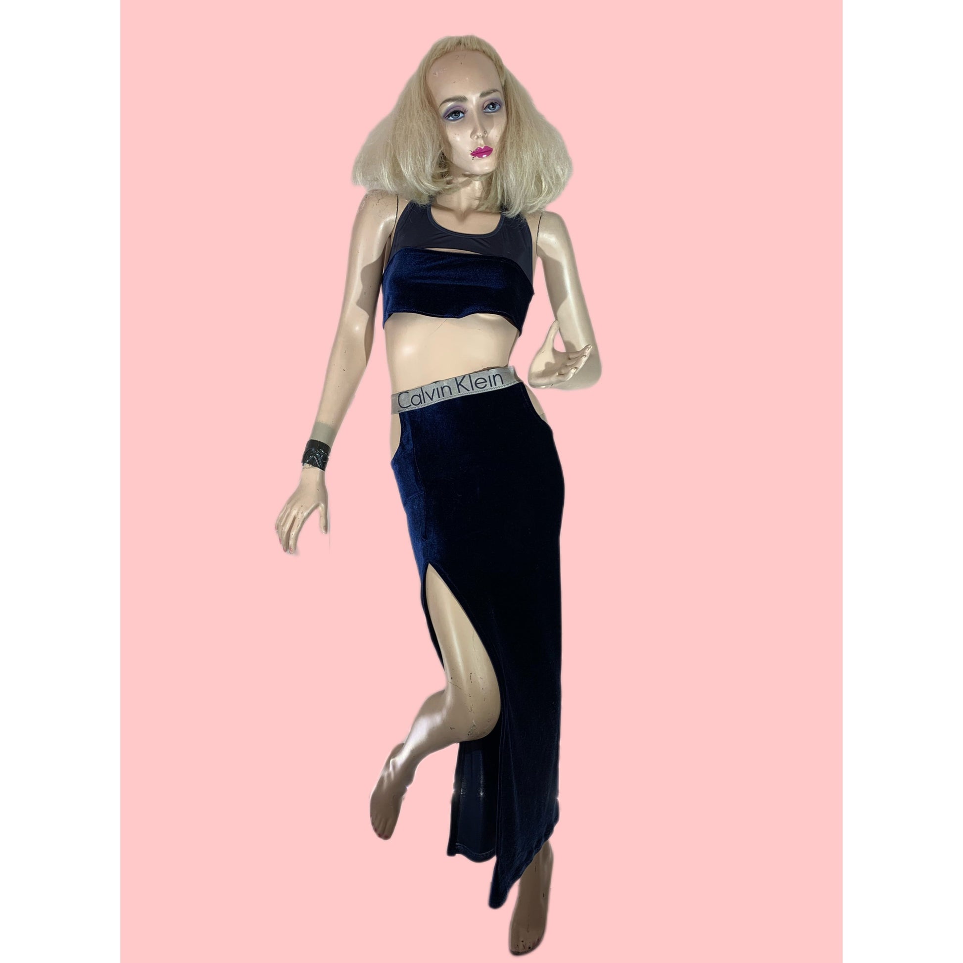 Feel like a fashion queen in this unique Upcycled Navy Blue crushed velvet Set! Made by turning a Calvin Klein sports bra into a turned into a top and skirt with a sultry slit.This one-of-a-kind outfit will have you feeling like a style icon. Get ready to serve serious looks and slay the street-style game with this bold, upcycled style. #upcycledgoals!