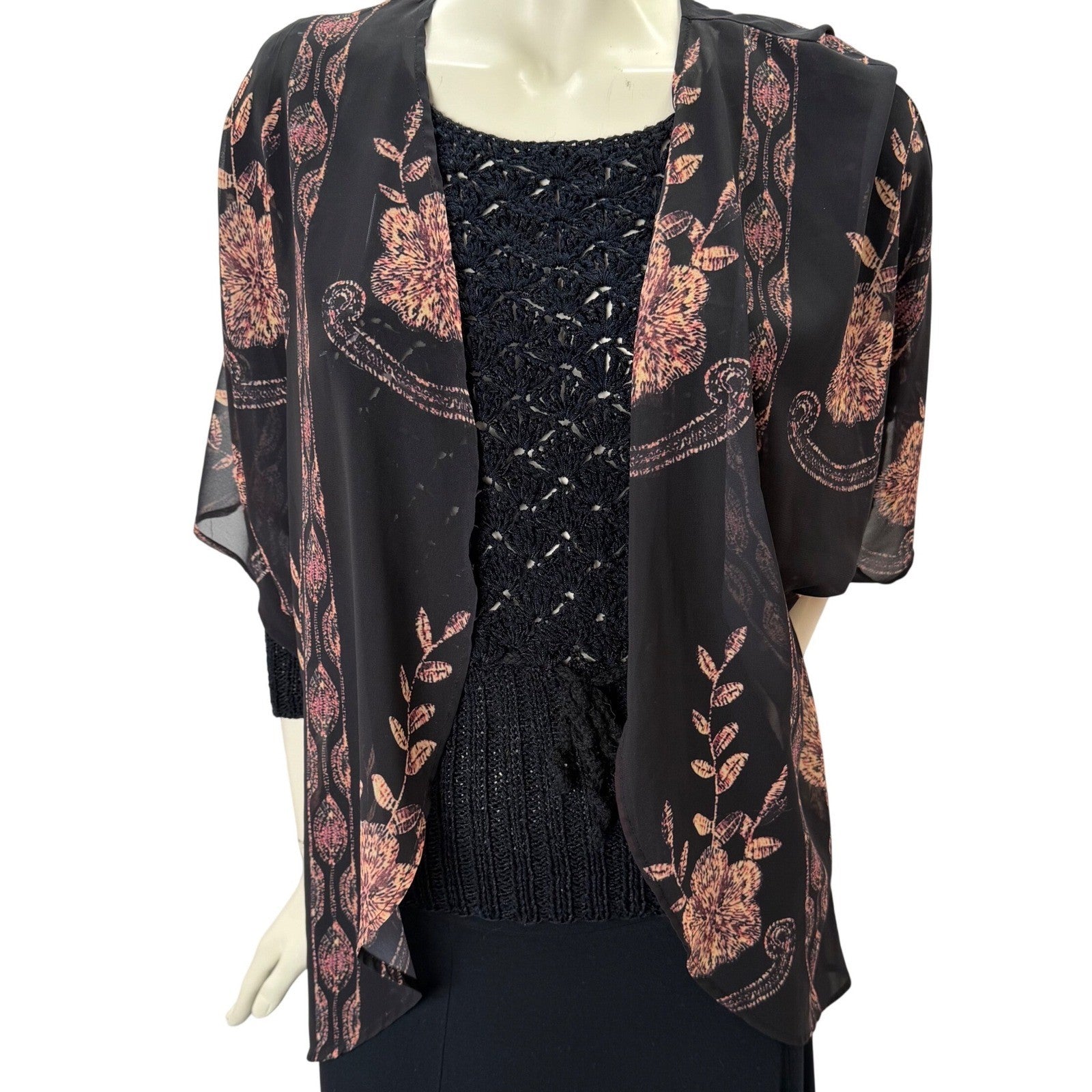 Womens Sheer Black Floral Kimono Wrap Open Front Draped Chiffon Boho Romantic